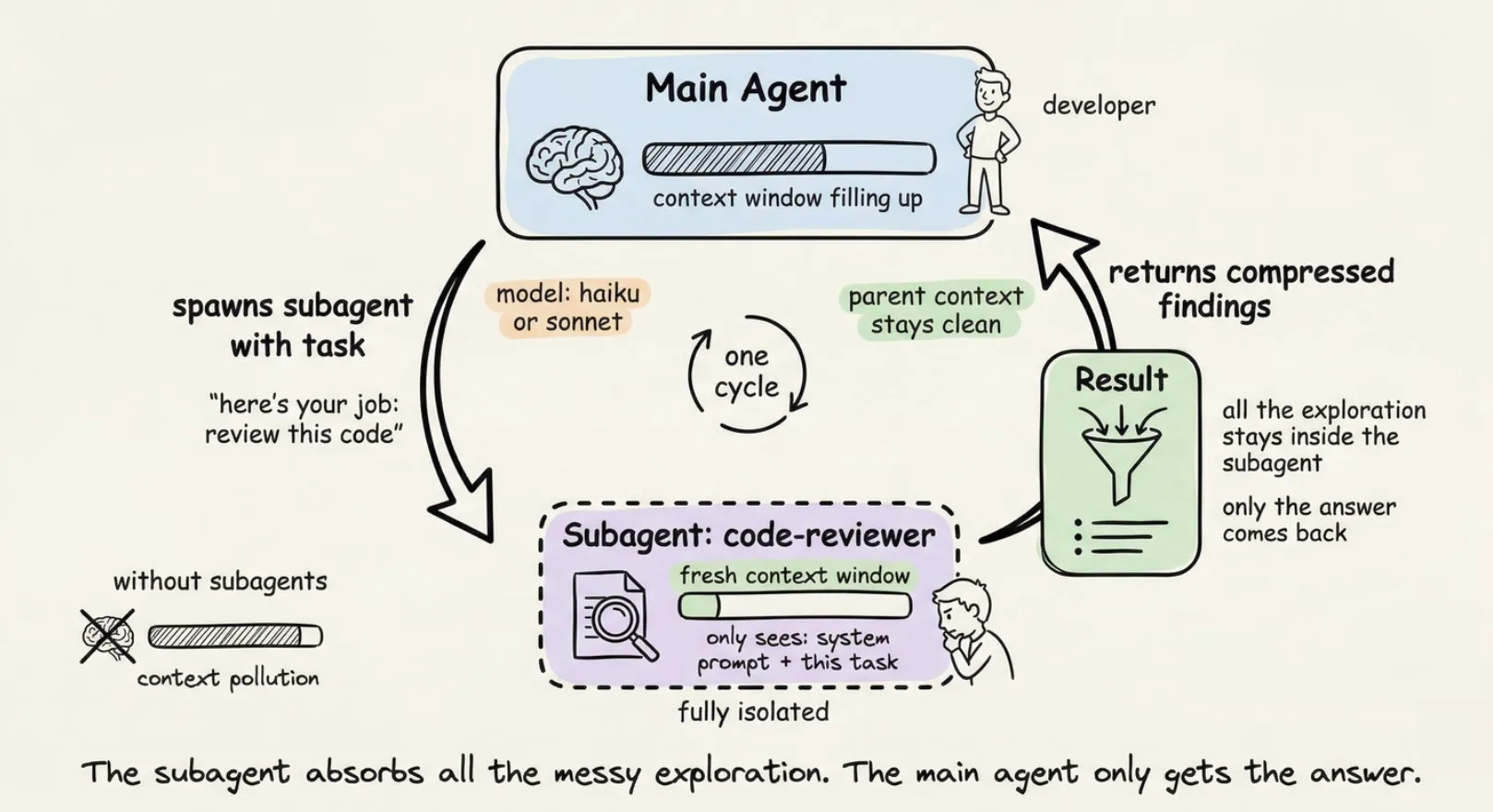 当 Claude 需要进行代码审查时,它会在独立的隔离上下文窗口中启动这个 agent。Agent 完成工作,压缩发现,然后报告给主会话。你的主会话不会被数千个 token 的中间探索过程所污染。